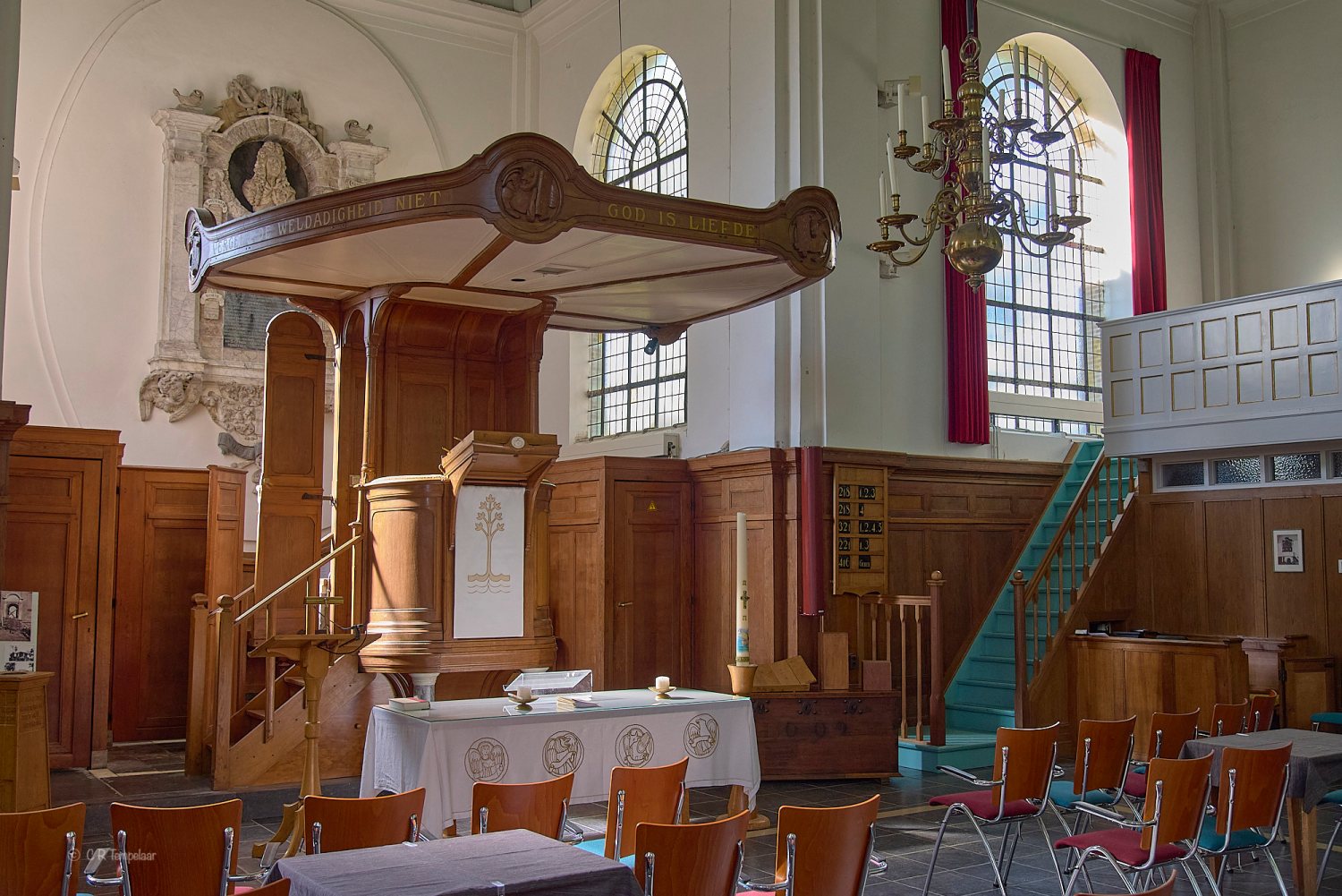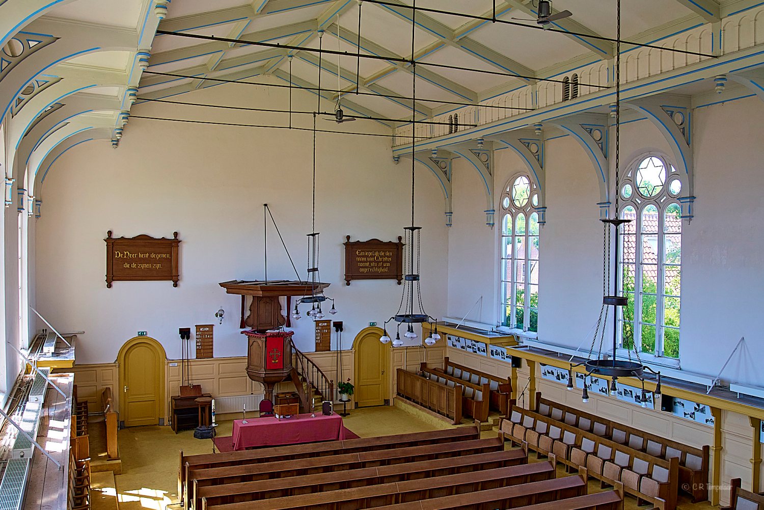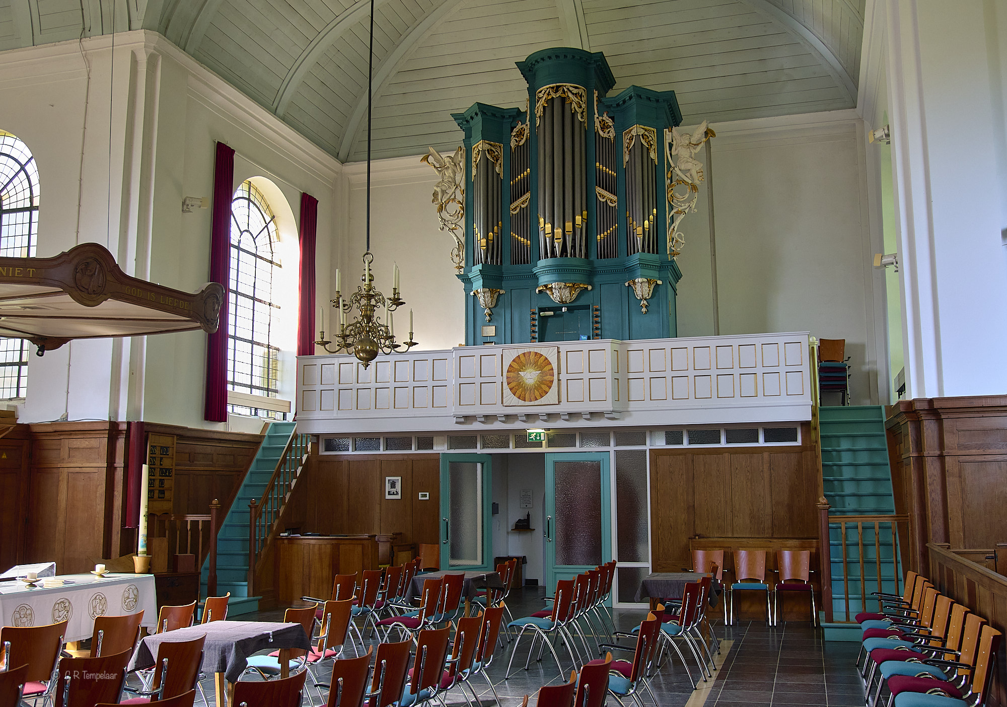 Kerkzaal en liturgisch centrum. Gebouw en preekstoel (1780, afkomstig uit de vorige kerk) zijn net als het orgel een rijksmonument.