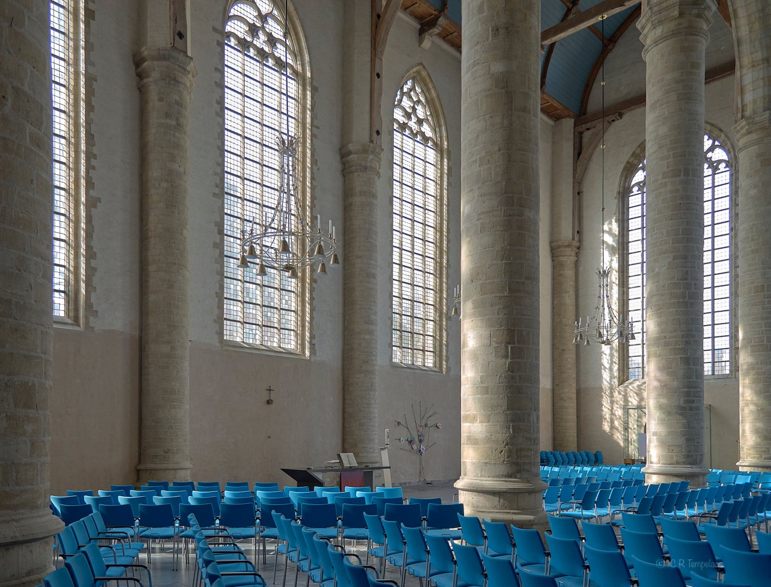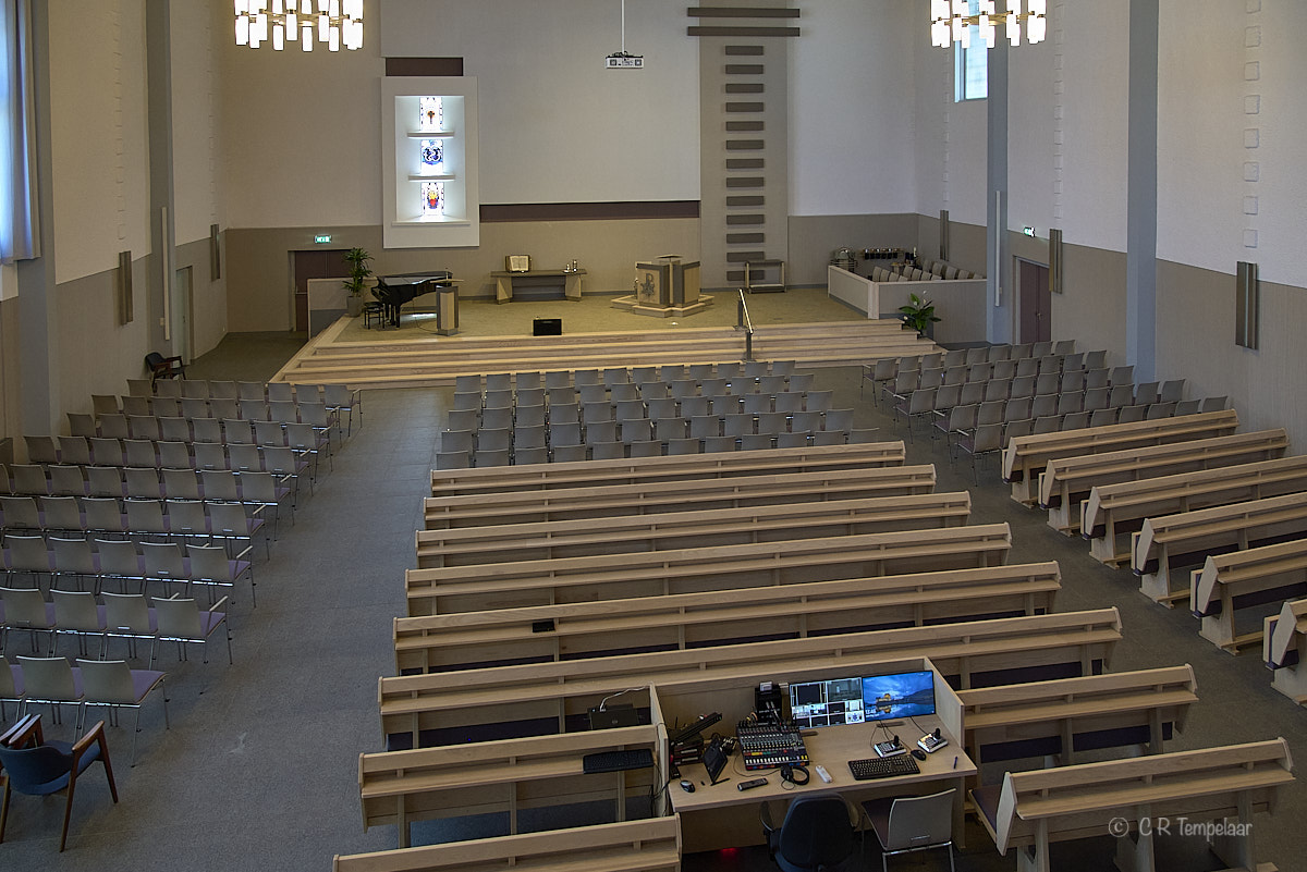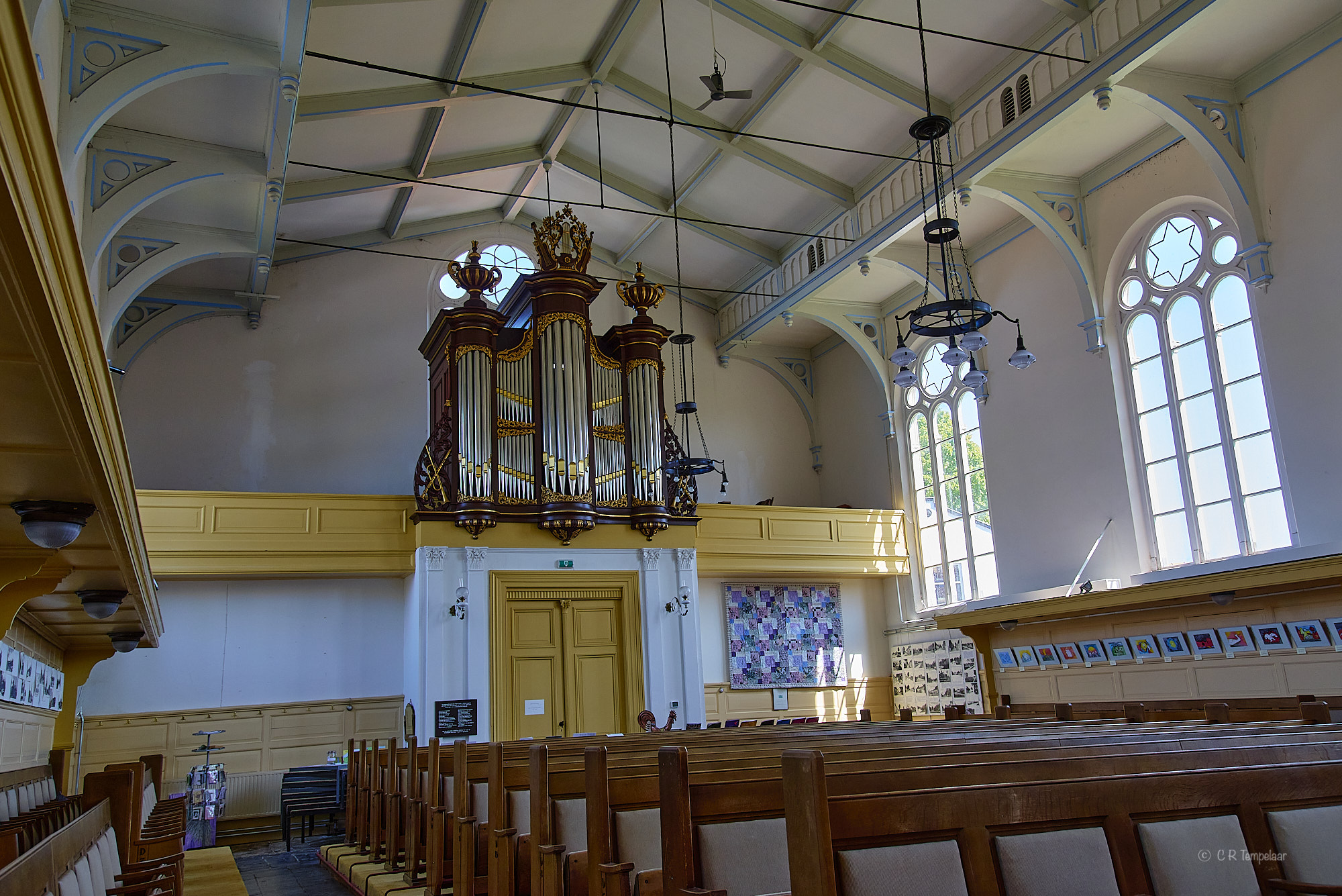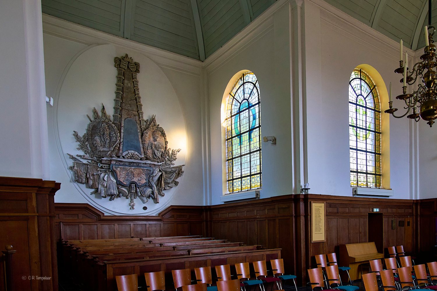 Kerkzaal en liturgisch centrum. Gebouw en preekstoel (1780, afkomstig uit de vorige kerk) zijn net als het orgel een rijksmonument.
