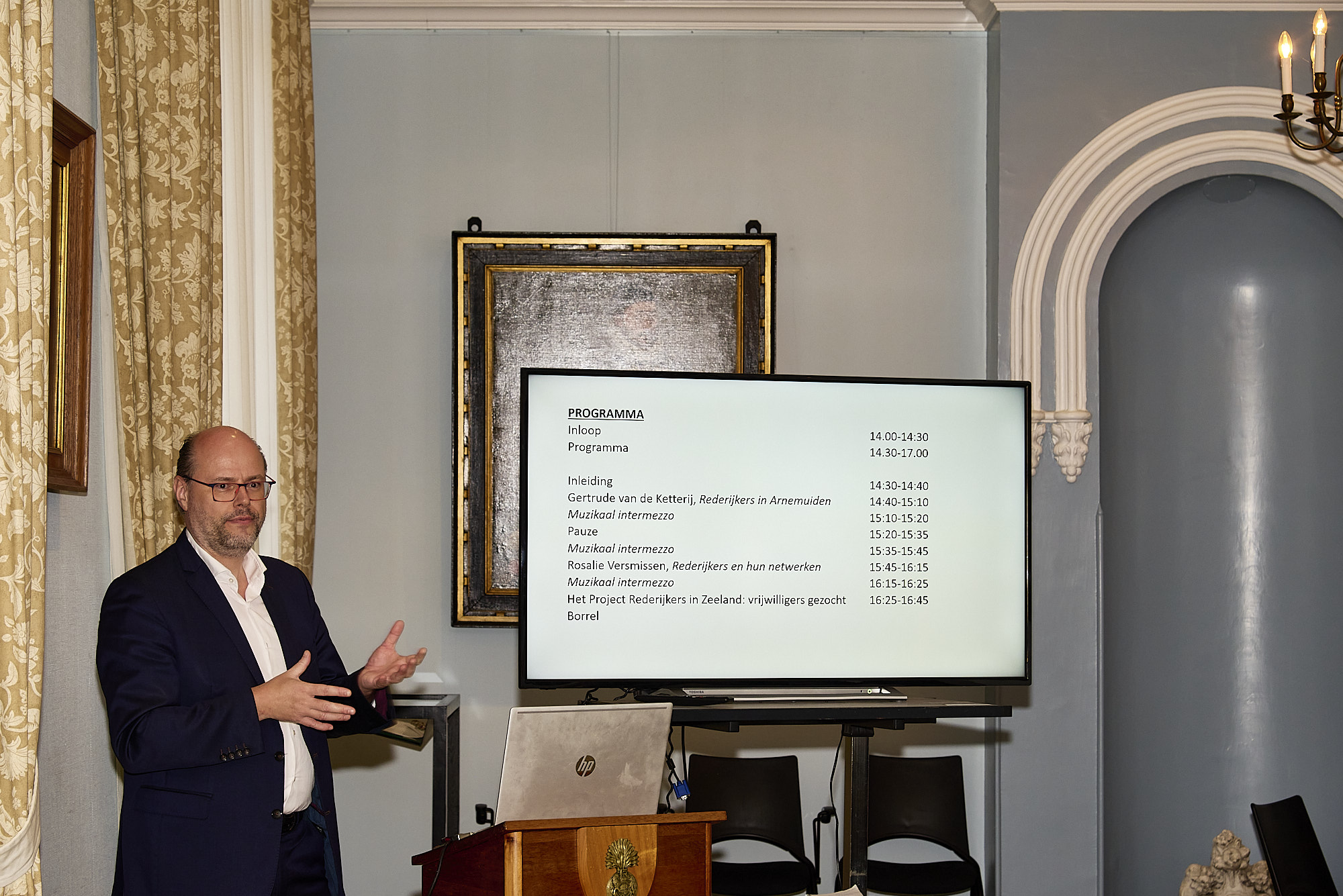 Het openbare programma van deze middag bestond uit een aantal lezingen en het tot klinken brengen van liederen uit rederijkerskringen. In de eerste lezing getiteld Rederijkers in Arnemuiden ging Gertrude van de Ketterij in op hetgeen zij gevonden heeft over Arnemuidens rederijkers in het licht van de geschiedenis van deze stad, die in 1574 stadsrechten kreeg van Willem van Oranje. Uit haar op onderhoudende wijze gebrachte betoog bleek ook wat voor bijzondere stad Arnemuiden in de loop der eeuwen is geweest.