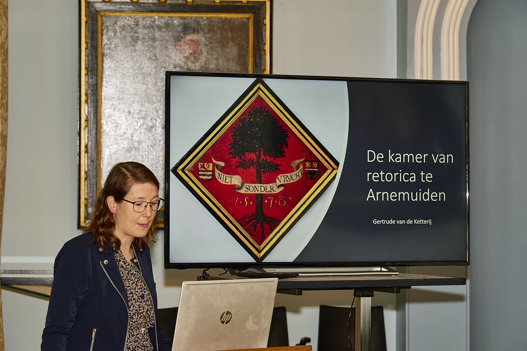 Publieksdag Om het werk ook naar buiten te brengen is er elke twee jaar een publieksdag ergens in Zeeland. Door de coronapandemie had dit even stilgelegen, maar dit jaar kon het weer. Op zaterdag 17 september vond de publieksdag plaats in het Museum Arnemuiden, gevestigd in het voormalige stadhuis. Het interessante van deze plaats was, dat er nog weinig bekend is van de rederijkerskamer in Arnemuiden. Gertrude van de Ketterij, betrokken bij het museum, was bij een studie die zij van de geschiedenis van Arnemuiden maakt, op een rederijkersgedicht uit 1578 gestuit. Dit gedicht was geschreven door een Arnemuidse rederijker voor een wedstrijd in Leiden. Deze tekst was tot nu toe niet bekend in Arnemuiden. Voor haar een goede reden om eens wat dieper in de geschiedenis van de rederijkers te duiken. In het museum van Arnemuiden zijn ook verschillende objecten van rederijkerskamers aanwezig.