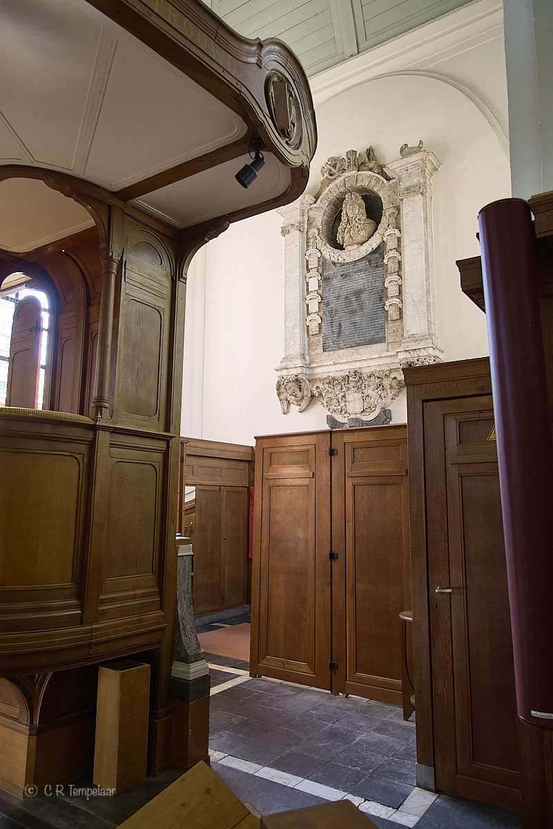 Achter de preekstoel het epitaaf van Pieter de Huybert, ambachtsheer van Burgh die veel voor Burgh heeft betekend en een van de stichters van de kerk is geweest. Aan de muur tegenover de preekstoel een groot epitaaf met twee portretmedaillons, obelisk en krijgsattributen voor Johannes de Huybert en zijn vrouw Catharina Cornelia de Huybert.