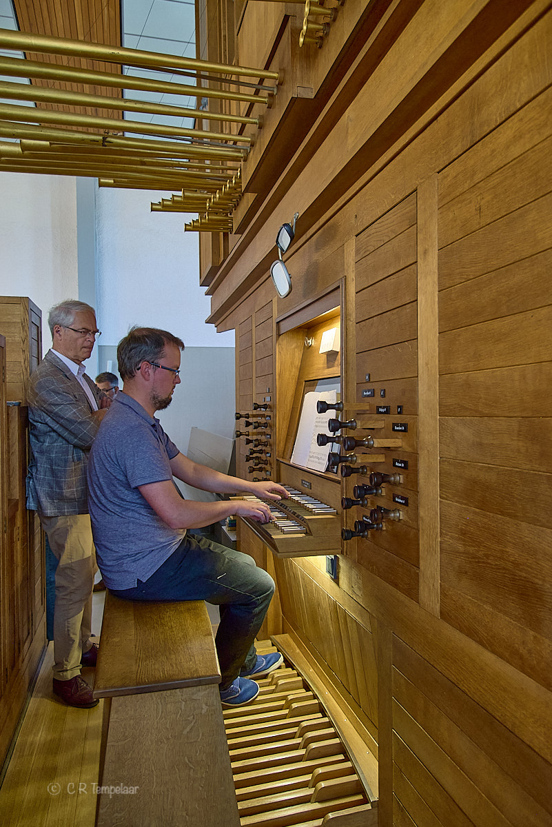 De deelnemers aan de excursie konden deze ervaring ook beleven door zelf op dit instrument te spelen. Een bijzonderheid is een in de lessenaar verwerkte monitor die verbonden is met een NAS (een op een netwerk aangesloten opslagmedium) waarop zettingen van liederen, voorspelen en andere bladmuziek voor de eredienst zijn opgeslagen. Orgelboeken zijn hier dus niet meer nodig.