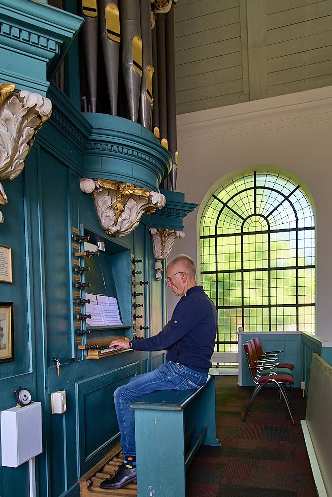 Bert bespeelt het orgel in de Dorpskerk in Burgh tijdens de laatste excursie van de Kvok op 3 juni 2023