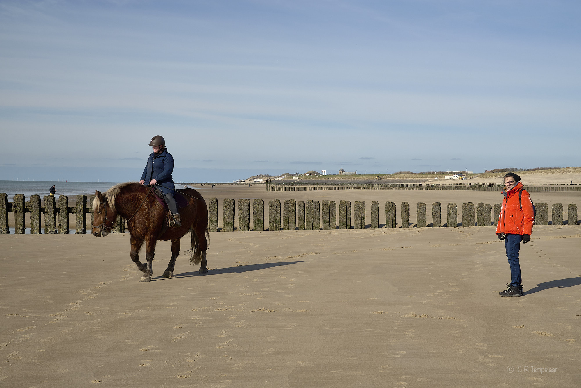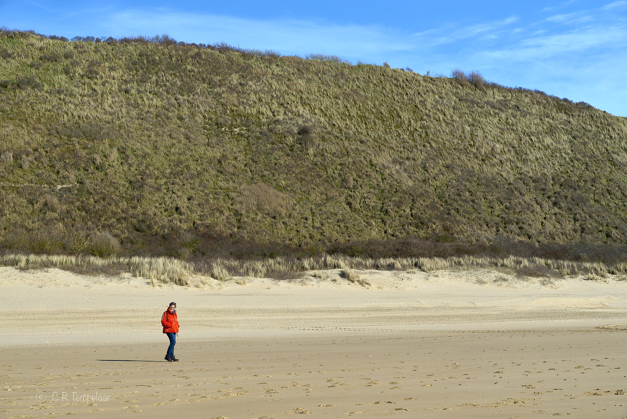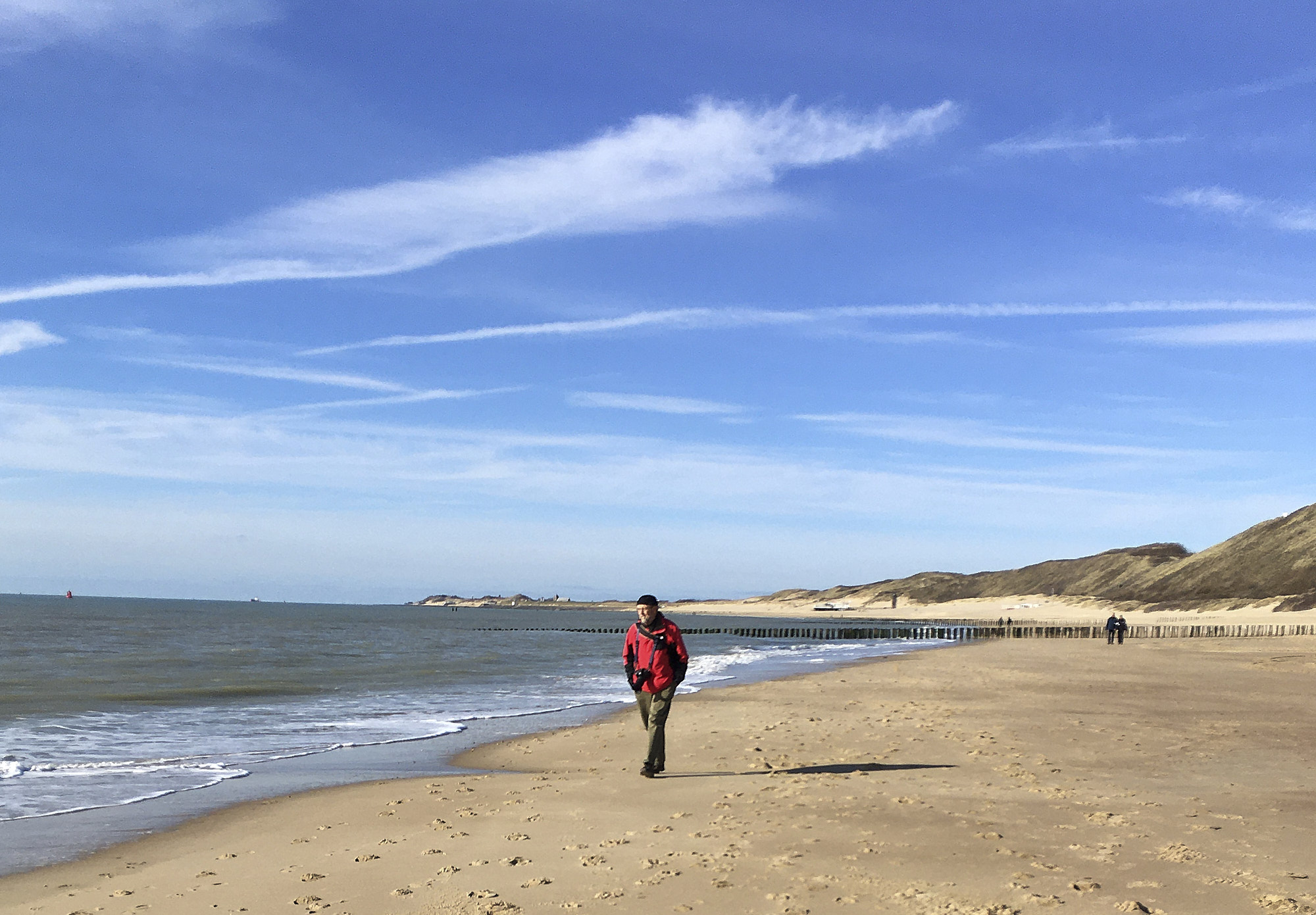 Maar gisteren was anders. Het was een stralende zonnige dag, een matig windje uit het noordoosten en de verjaardag van mijn lief, 76 lentes telt ze nu. Omdat we dat zondag al hadden gevierd met familie konden we van deze een dag lang durende opklaring buiten gaan genieten. Om een uur of 11 reden we naar Dishoek om van daar over het strand naar Zoutelande te wandelen. Het was laag water en het strand lag eindeloos breed voor de imponerend hoge duinen. En gelukkig was er aan de voet van de duinen nog niet de afgrijselijke rij met hokjes die hier over een poosje weer worden opgesteld. Die verknoeien het beeld van deze prachtige natuur. Het was stil op het strand, slechts hier en daar liepen wat mensen, soms met hun hond, af en toe kwam er een zeeschip voorbij. Op het gemak lopend langs de waterlijn zag ik plots een vrouw die deed alsof het al wel lente was. Ze liep in haar bikini zonder dralen het water in en bleef daar een poosje rondhangen. Ik heb het thuis even nagekeken: de watertemperatuur is nog geen 8ᵒ. Dit was nog eens wat anders dan een Nieuwjaarsduik van 10 seconden, ze nam echt een bad. Ik voelde me comfortabel in mijn winterjack met mijn mutsje op. Ieder zijn genoegen. Na zo’n 5 kwartier wandelen kwamen we in Zoutelande aan voor een lunch bij De Babbel. Op het beschutte terras was het in de zon zo lekker dat de jassen uit gingen. Zo kregen we toch ook wel een lentegevoel. De wandeling terug was ook een feestje. De zon bleef schijnen, er waren hooguit wat lichte sluierwolken die geen afbreuk deden aan het zonnige karakter van deze dag. Onderweg zagen we zelfs mensen aan de voet van de duinen in het zonnetje liggen, ook al alsof het toch al lente was, misschien voorgenietend van hoe het in de zomer zal zijn. Alleen kan dat dan niet daar want dan staan die hokjes er. Of misschien lagen ze op de plek waar hun hokje zou komen te staan. Het was in ieder geval een leuk gezicht. Na weer zo’n 5 kwartier wandelen en slenteren langs het snel opkomende water met aan het eind nog over de dubbele duinenrij kwamen we weer op de parkeerplaats bij Dishoek.