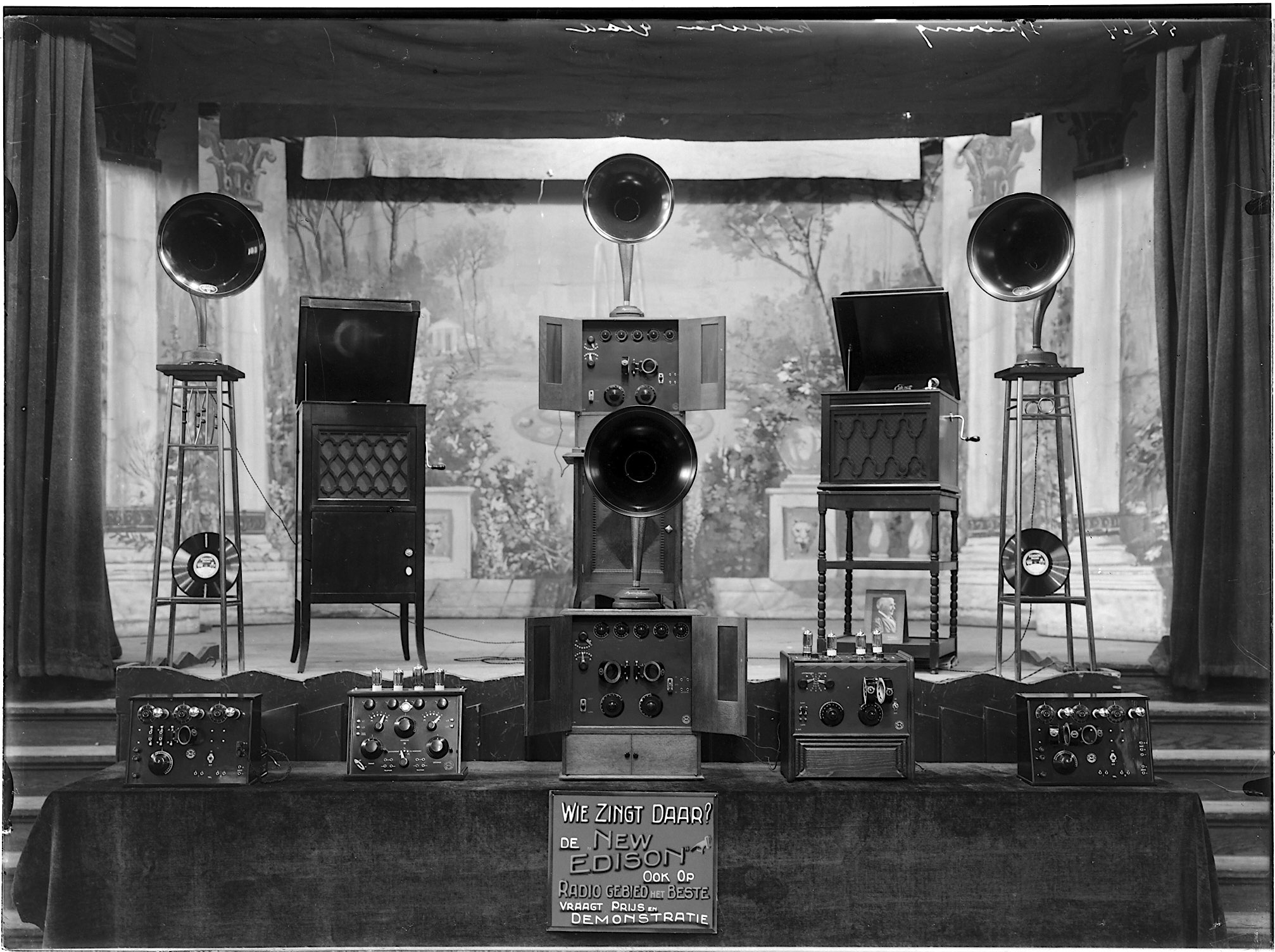 Opstelling van radio’s (New Edison), luidsprekers en gramofoonplatenspelers bij muziekhandelsfirma M. Spiering op de Voorstraat.