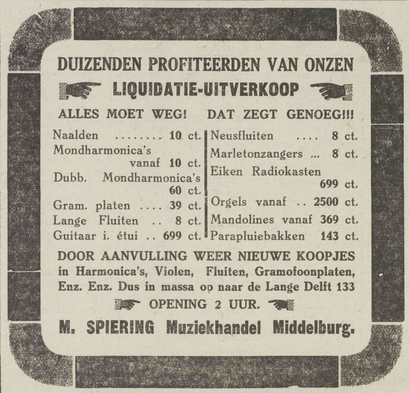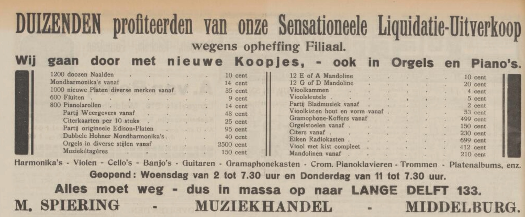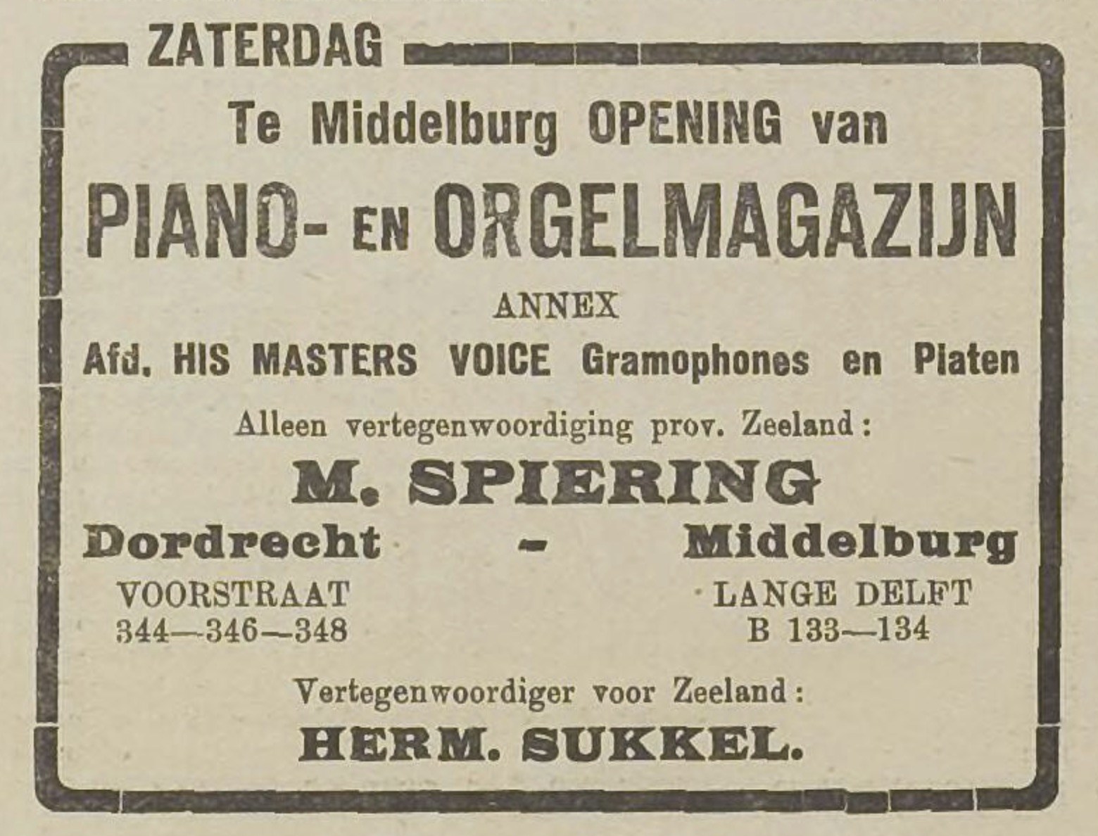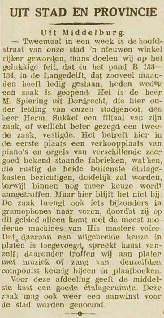 Bijzonder vond ik het dat door deze winkel veel aandacht werd geschonken aan een nieuw, heel ’modern’ fenomeen: de grammofoon. Uit de advertentie blijkt dat de firma de alleenverkoop voor Zeeland had van ’de meest moderne machines van His Master’s Voice’ en daarbij een uitgebreide keuze in platen. Zij trok ermee de provincie in om demonstraties te geven met deze ’gramophones’. Voor velen moet het een sensatie zijn geweest om op die manier naar muziek te luisteren.
