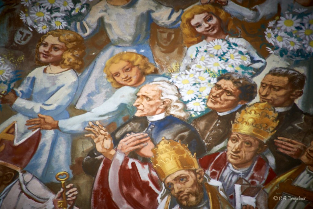 Sinds ik begin jaren ’90 van de vorige eeuw een vaste aanstelling kreeg als organist van de Petruskapel in Dordrecht, ben ik lid van de organistenvereniging. Toen ik in 2010 naar Zeeland verhuisde ging ik meedoen met de provinciale afdeling daar en kwam er in 2013 in het bestuur als secretaris. De vereniging heette inmiddels na een fusie KVOK en dat is nog steeds de naam. Tot de activiteiten behoort jaarlijks een excursie naar een paar orgels en zo was er in 2013 de excursie naar Goes. Na een bezoek aan de Grote of Maria Magdalenakerk waarin het grote Marcussenorgel met de Turkse kap, staken we over naar de rooms-katholieke kerk met dezelfde naam. En terwijl de deelnemers speelden met en op het orgel, kwam bij mij ineens de vraag op of hier misschien ook een beeld van de Pastoor van Ars zou staan. Een zoektocht door de kerk leverde niets op. Toen maar nagevraagd bij de koster. Er stond geen beeld maar op één van de muren was een grote verzameling heiligen afgebeeld. Daar zou de pastoor van Ars tussen zitten. Inderdaad was daar temidden van een wolk van heiligen, engelen en prelaten zijn gezicht, duidelijk herkenbaar. Hij is dus ook in Zeeland.