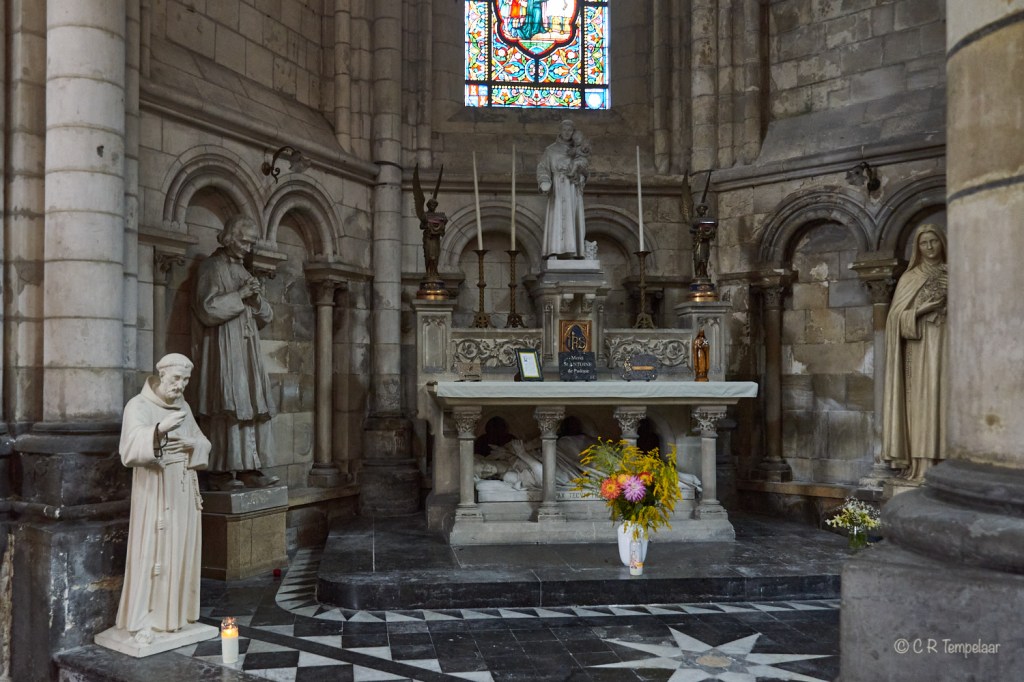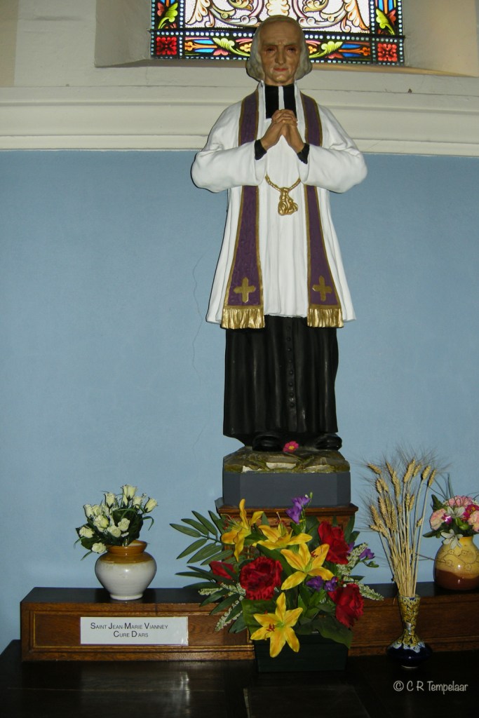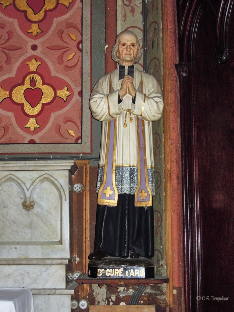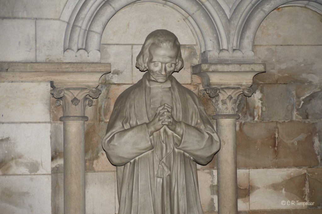 In september 2015 kampeerden we bij Éperleque, een dorp in de buurt van Calais. Het nabijgelegen Saint-Omer heeft een grote kathedraal, de Notre-Dame. Die moest ik natuurlijk bekijken en wat trof ik daar tot mijn verrassing behalve een imposant orgel van de beroemde bouwer Cavaillé-Coll? Juist, ook hier een standbeeld van de Pastoor van Ars. Dit beeld heeft wat weg van het monument dat Émilien Cabuchet in 1865 van hem maakte, een zeer gevoelig portret in marmer. Grote devotie spreekt uit beide beelden.