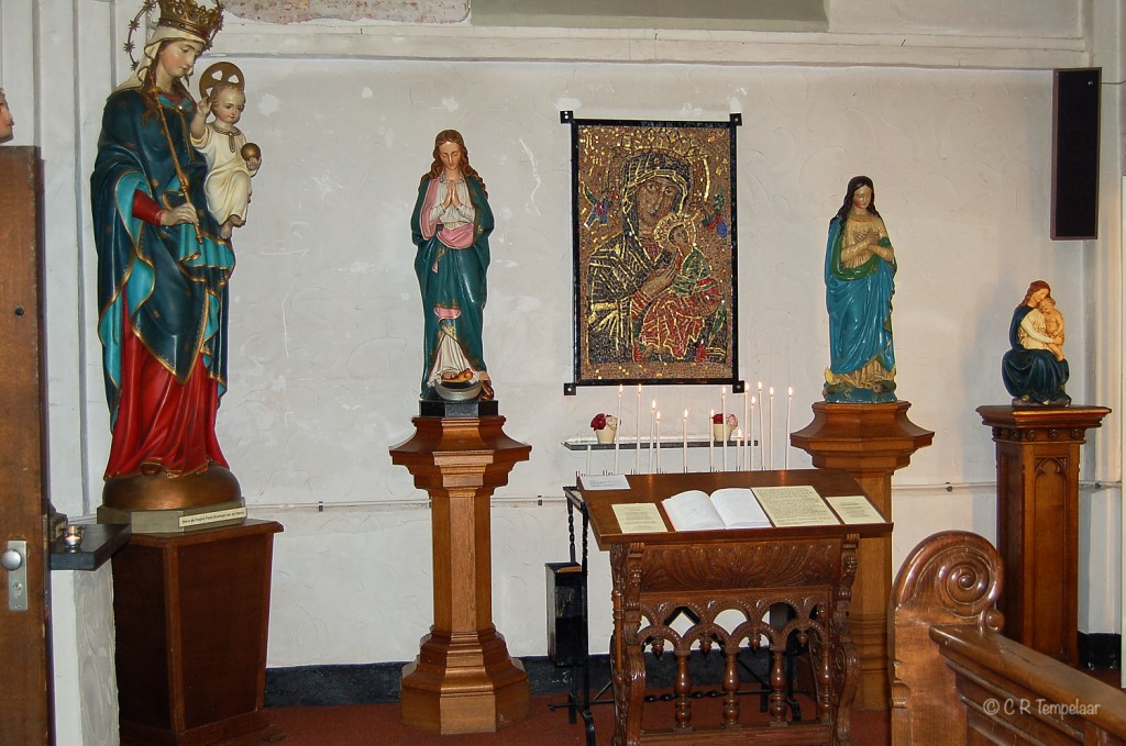 De kerk heet de Antoniuskerk en is ontworpen door de befaamde architect Pierre Cuypers (1827-1921), de man die naast heel veel kerken het Rijksmuseum en het Centraal Station van Amsterdam heeft ontworpen. De kerk dateert uit 1856 en is in neogotische stijl gebouwd. Bijzonder is dat Pierre Cuypers ook de kas van het orgel ontworpen heeft, in dezelfde stijl. Wij erheen en we troffen een kerkruimte vol met beelden, of we weer even in Rome waren, met zelfs voor een destijds stevige protestant als ik bekende beelden. Franciscus en Clara van Assisi, Antonius van Padua en Ignatius de Loyola, Theresa van Avila – de grote jongens en meisjes, zeg maar. En Moeder Maria natuurlijk, in meerdere gedaanten, al dan niet met kind. Daarnaast veel meer beelden en ook kerkelijke voorwerpen als crusifixen, wierookvaatjes en kandelaren. En ergens daartussen een wat onooglijk uitziend mannetje, met halflange grijze haren. Ik zag hem maar ging aan hem voorbij, zonder een foto te maken.