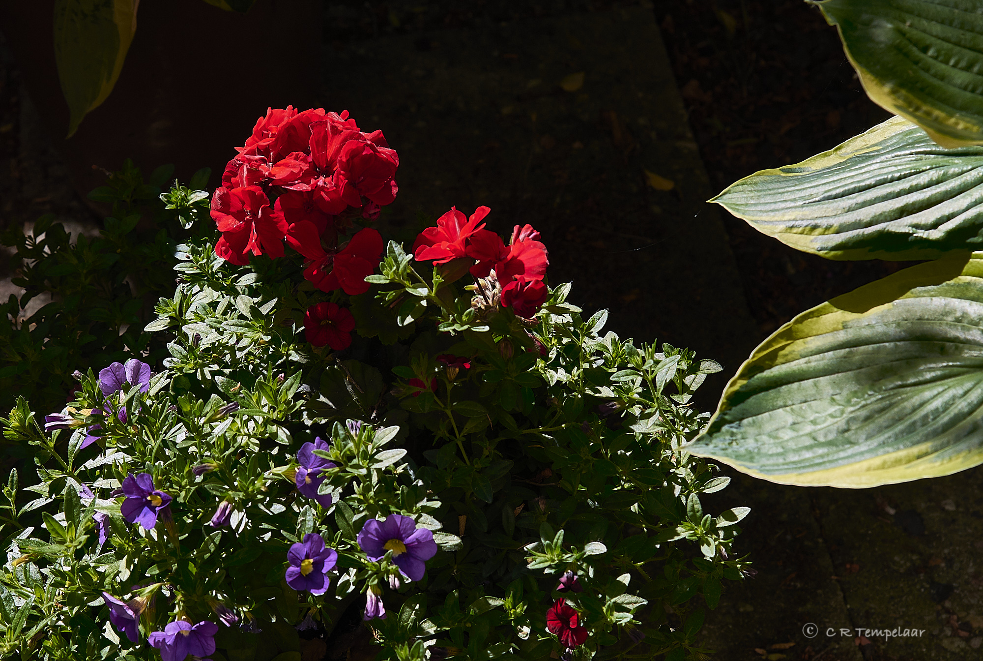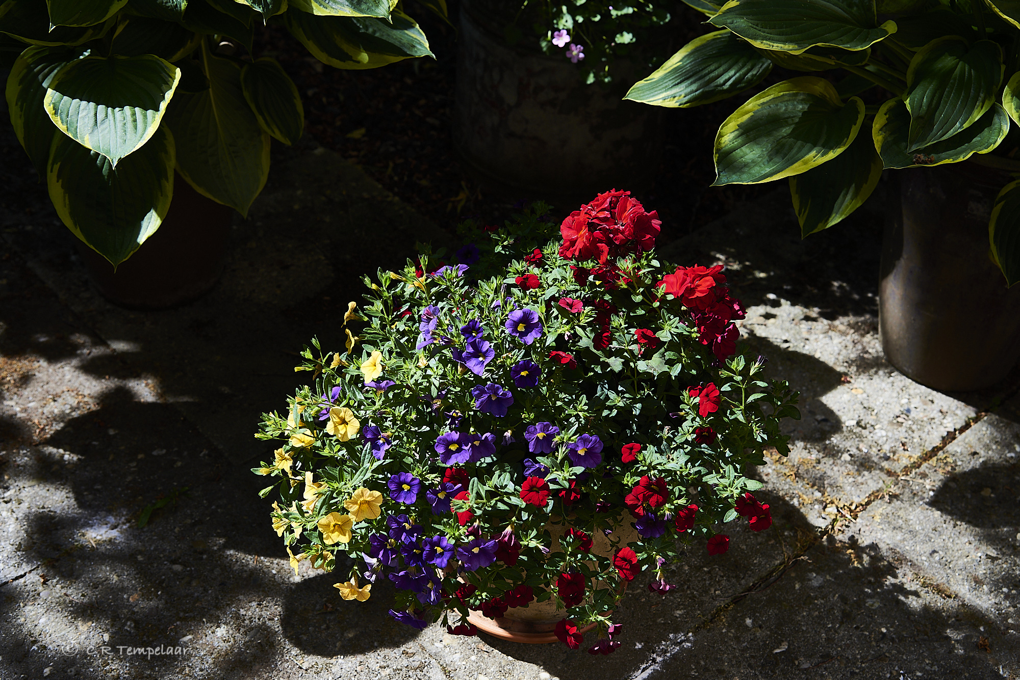 Pelargonium, Petunia, Hosta in potten bij de voordeur