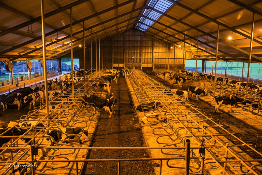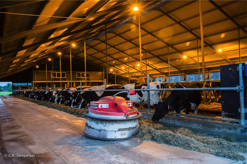 Avondsfeer in de koeienstal. De automatische voeraanschuiver rijdt door de stallen en zorgt ervoor dat de koeien aan het hek steeds goed bij het voer kunnen. De grote stal is zo ingericht dat de koeien zelf bepalen wat ze doen: staan, liggen, drinken, voeren, gemolken worden, een eindje lopen, de rug laten borstelen. Alles computergestuurd en gedoseerd. Alleen de weidegang ontbreekt.